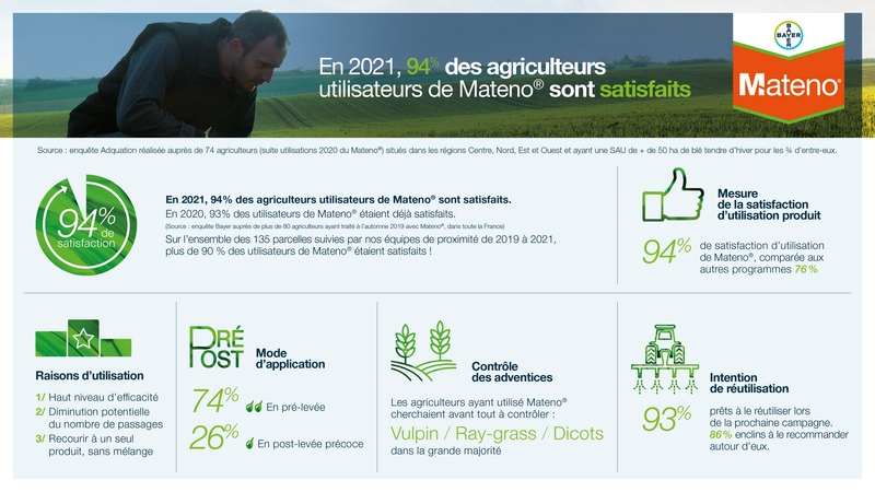 En 2020, 93 % des utilisateurs de Mateno® étaient déjà satisfaits (source : enquête Bayer auprès de plus de 80 agriculteurs ayant traitées à l’automne 2019 avec Mateno®, dans toute la France). Soit sur 2 ans (2019 et 2020), déjà 135 parcelles Mateno® suivies, avec plus de 90 % des agriculteurs satisfaits.