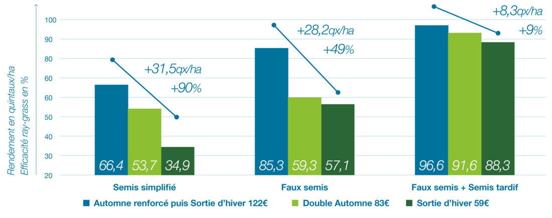 Le programme automne-sortie d'hiver, associé aux leviers agronomiques tels que faux semis + semis tardif, apporte 96,6% d'efficacité.