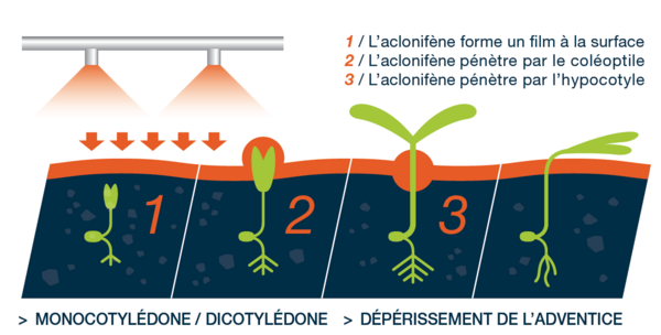 La particularité physico-chimique de l’aclonifène qui entraîne la formation d'un film à la surface du sol apporte d'autant plus de souplesse d’intervention à Mateno®. Dans l'idéal, Mateno s'applique dès la prélevée, au plus proche des semis, sur sol humide pour bénéficier de la fraicheur du sol, condition favorable aux matières actives à mode d'action racinaire. Lorsque les conditions sont difficiles, Mateno peut également s'appliquer sur sol sec sans pour autant perdre en efficacité. Le mode d'action spécifique de l'aclonifène contribue à sécuriser l'efficacité de l'herbicide.