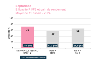 Pour sécuriser la protection du blé face aux souches de septoriose résistantes aux fongicides, Bayer propose en 2025 les packs Jessico® Star, Jessico® Easy, Jessico® Plus, Jessico® Néo et Jessico® Néo New. Sans triazole, ces packs se composent de Silvron® /Nepal®, associant deux SDHI et de Jessico® One, composé de la substance active fenpicoxamide. Celle-ci apporte un nouveau mode d’action. L’efficacité est au rendez-vous. Elle se prouve dans les essais 2023 et 2024 d’Arvalis et dans ceux de Bayer.