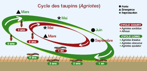 Pour les espèces à cycle long (Agriotes lineatus, A. obscurus, A. sputator...), leur développement demande 4 à 5 ans.