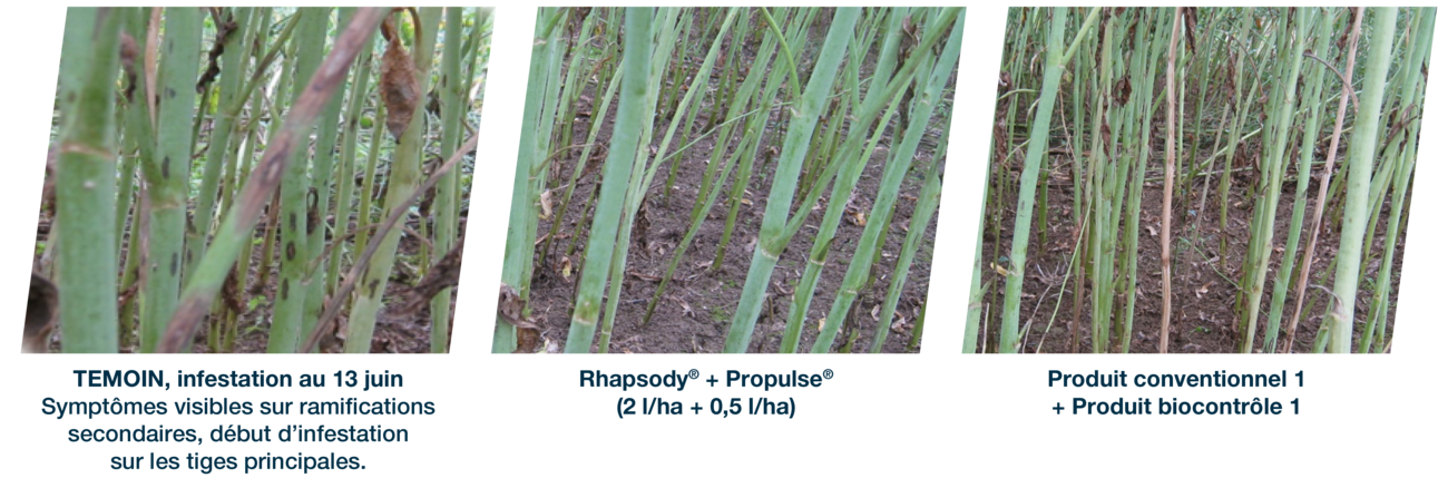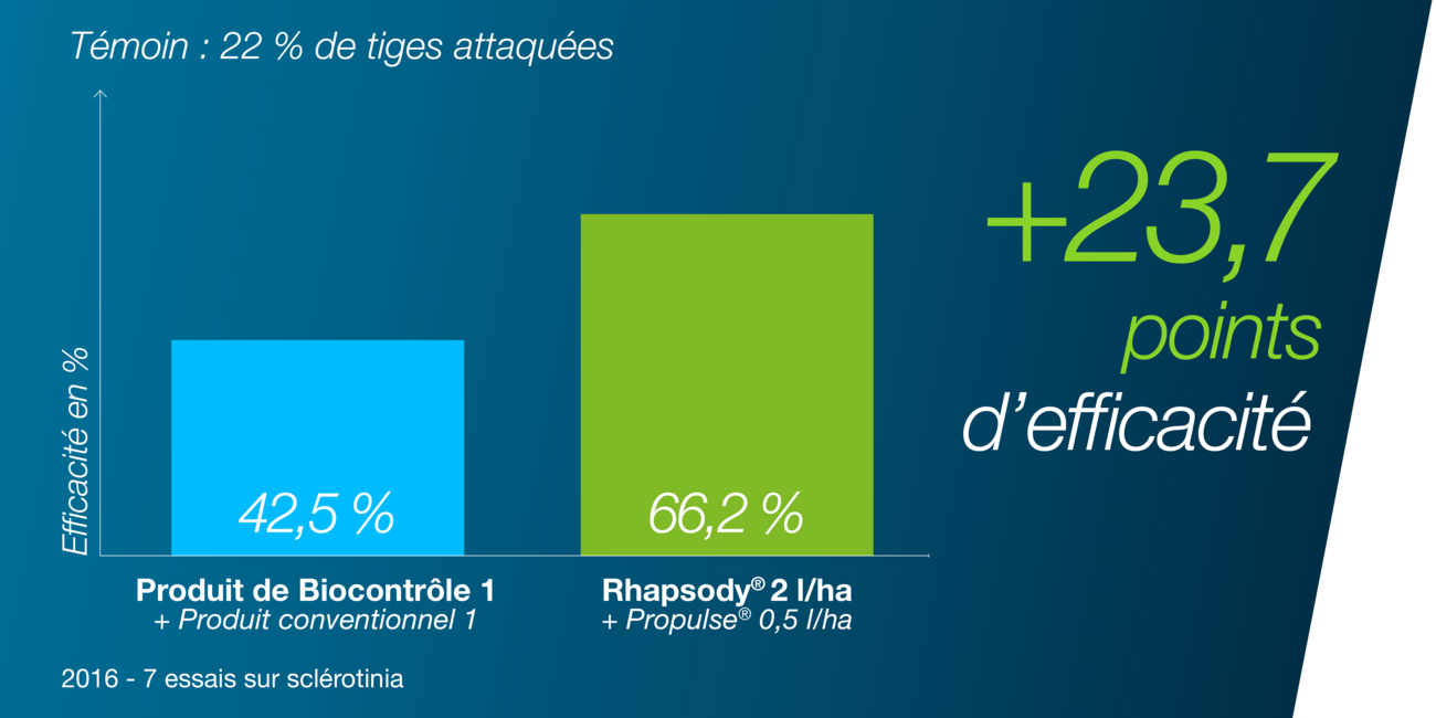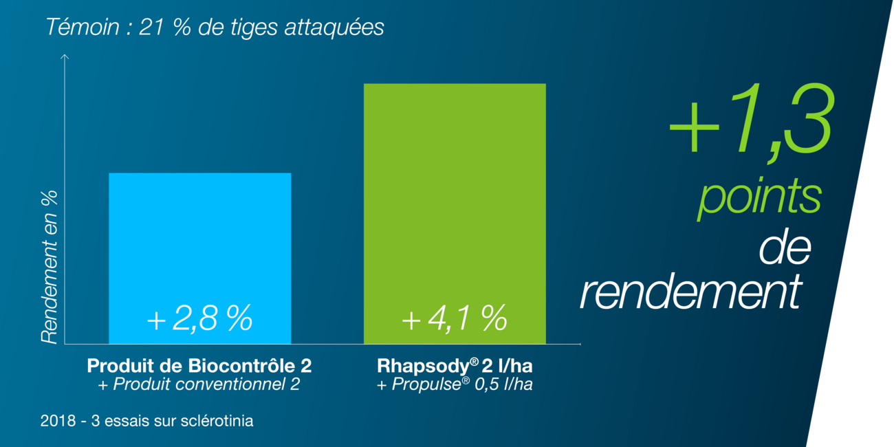 Le sclérotinia est aujourd’hui la maladie la plus pénalisante sur colza. Avec Rhapsody®, Bayer propose une association de biocontrôle des plus performantes basée sur un nouveau mode d’action pour lequel, à ce jour, aucune résistance n’a été observée. Associé à une demi-dose du fongicide Propulse® (125g/l de fluopyram et 125g/l de prothioconazole), Rhapsody® est préconisé contre le sclérotinia à la dose de 2l/ha pour une bonne régularité d'action, quelles que soient les conditions pédo-climatiques.