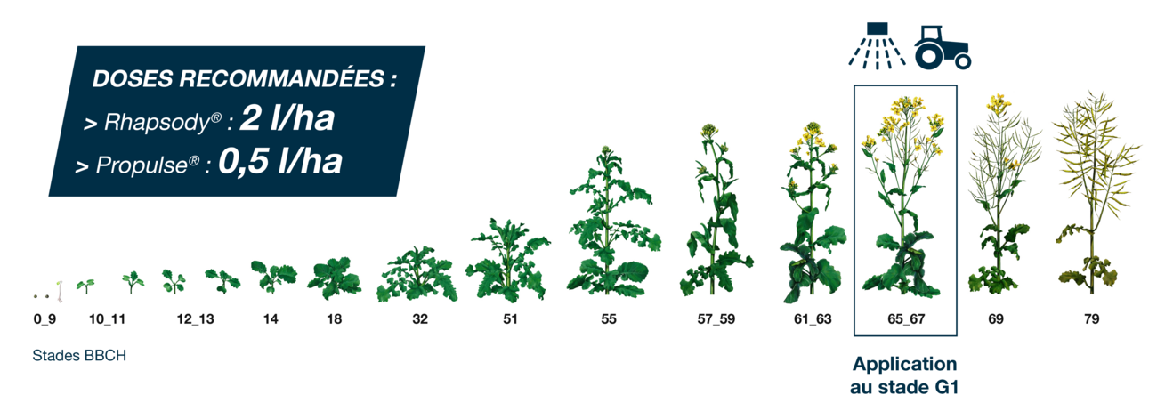 Un spectre large. L'association des modes d'action complémentaires de Rhapsody® et Propulse® permet de contrôler les maladies du colza à un bon niveau d'efficacité. Qu'il s'agisse du sclérotinia, mais également d'autres maladies telles que l'alternaria, la cylindrosporiose, la pseudocercosporellose et l'oïdium du colza.