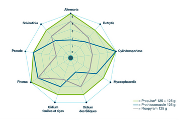 Non seulement le fongicide agit contre le sclérotinia mais il présente aussi une très bonne efficacité contre les autres maladies du colza : Alternaria, Cylindrosporiose, Pseudocercosporella, Oïdium et Mycosphaerella. Cette efficacité démultipliée provient de la complémentarité des deux substances actives, le fluopyram et le prothioconazole. Protéger le colza avec Yearling / Propulse, c’est viser l’ensemble des maladies avec un seul produit pour plus de sérénité.