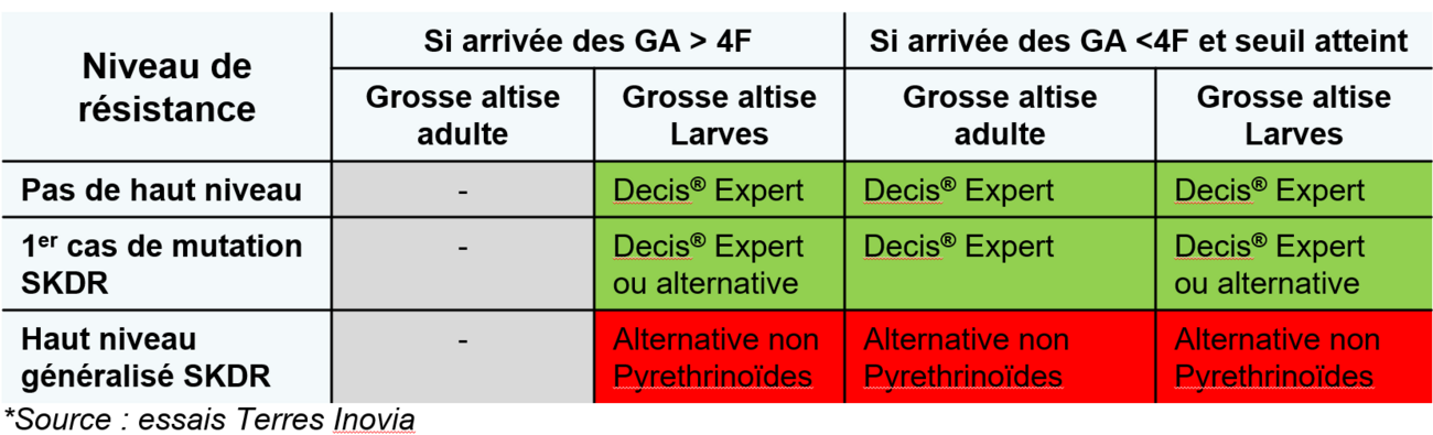 Le choix de l’insecticide dépend à la fois du stade de sensibilité de la culture, de laprésence des altises et enfin du niveau et du type de résistances.