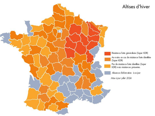 Niveau de résistance des populations de grosses altises en 2024 (mise à jour juillet 2024) – Source : Terres Inovia