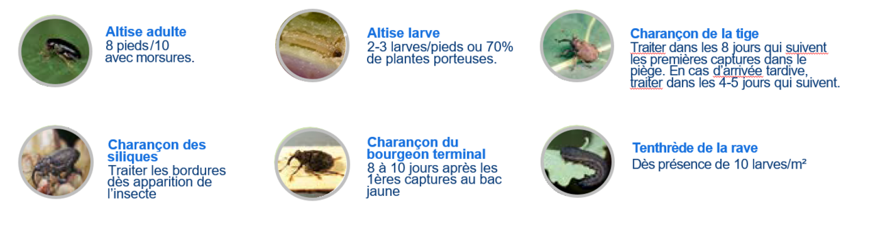 - 2-3 larves/pieds ou 70 % de plantes porteuses en cas de risque agronomique élevé (faible biomasse de colza).