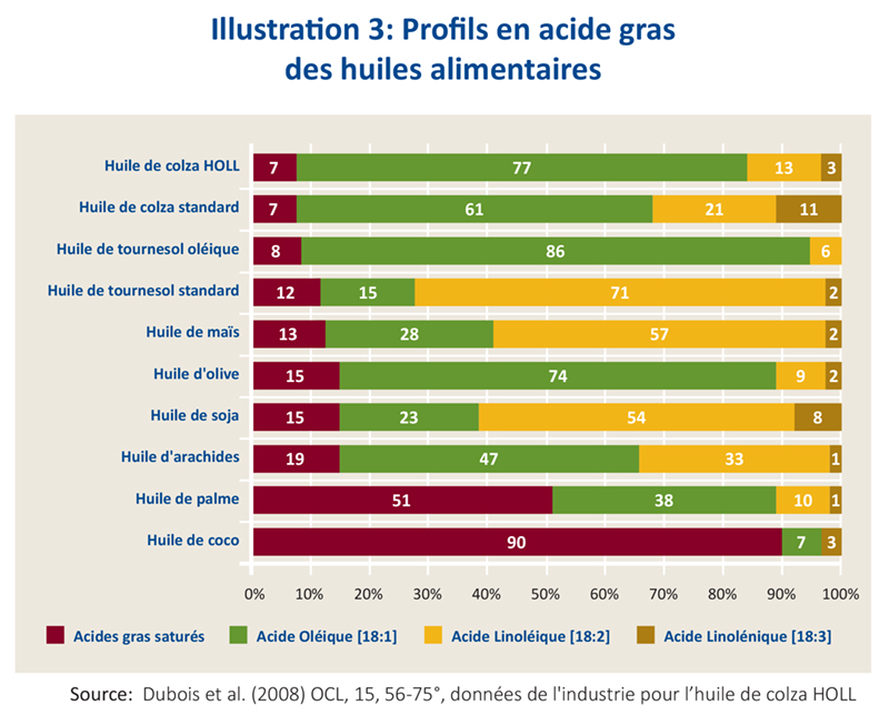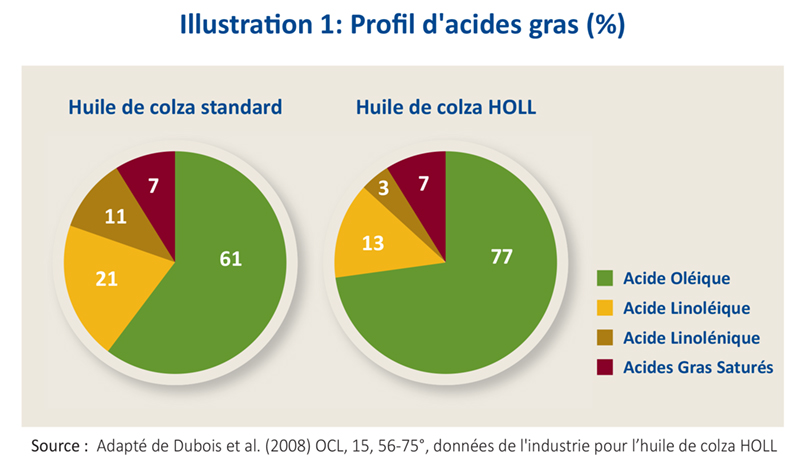Par rapport à l'huile de colza standard, l'huile de colza HOLL a une teneur en acide oléique supérieure à 75 %, tandis que la teneur en acide linolénique a été réduite à moins de 3,5% (ill. 1).