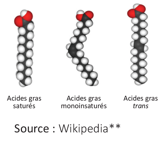 **Source - illustration : Acides gras - modèles moléculaires : Acides gras saturés : https://commons.wikimedia.org/wiki/File:Myristic-acid-3D-vdW.png / Acides gras monoinsaturés : https://commons.wikimedia.org/wiki/File:Oleic-acid-3D-vdW.png /Acides gras trans https://en.wikipedia.org/wiki/Trans_fat#/media/File:Elaidic-acid-3D-vdW.png