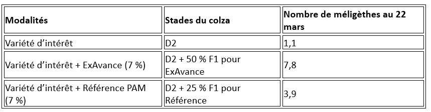 L'attractivité du colza ExAvance vis-à-vis des méligèthes constitue un levier agronomique significatif pour la protection de la culture. En fleurissant plus tôt, ExAvance agit comme un leurre naturel, détournant les méligèthes des boutons floraux de la variété d’intérêt.