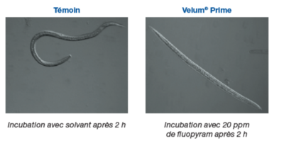 Solution de traitement de sol à base de fluopyram, Velum® Prime a une activité larvicide directe. Les larves de nématodes sont paralysées sous 1 à 2h et meurent, les empêchant alors de se développer et d’attaquer la culture.