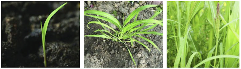 De gauche à droite : Panic pied de coq au stade de développement des feuilles, Panic pied de coq au stade du tallage et Panic pied de coq au début de la floraison
