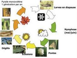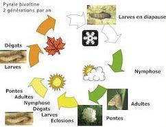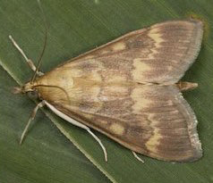 L’adulte de la pyrale est un papillon avec des ailes fines et larges, triangulaires, de couleur beige-ocre, au corps étroit avec des antennes fines et cylindriques.