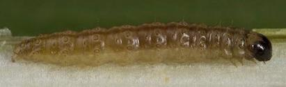 La larve est une chenille de 2 à 20 mm selon le stade : elle est gris-jaune avec une tête sombre, une ligne dorsale gris foncé et des points foncés sur chaque segment, répartis de part et d’autre de cette ligne.