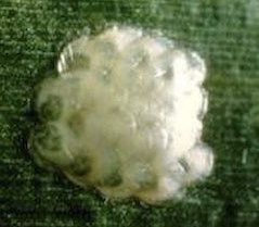 Vous pouvez également observer les œufs, sur la face inférieure des feuilles : ils sont ovales, plats et disposés comme des écailles de poisson, par grappes irrégulières de 5 à 10 mm comprenant entre 15 et 30 œufs.