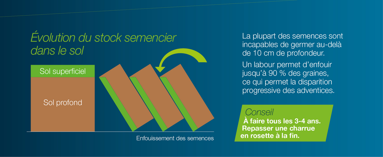 Le labour permet de « tamponner » les évolutions de flore : s’il n’est pas trop dressé, il enfouit une grande majorité du stock semencier superficiel, et remonte les graines jusqu’alors incapables de germer car trop profondes. Les graines en profondeur perdent leur viabilité au cours du temps, notamment les graminées. Il élimine par la même occasion les adventices levées.