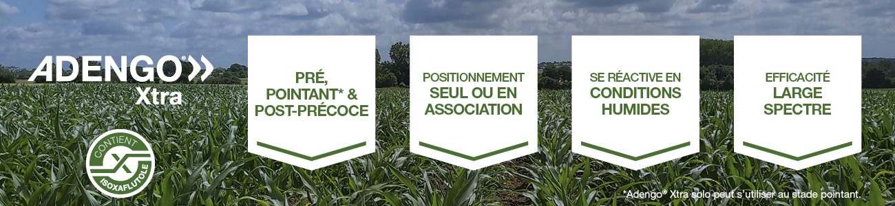 Désherber tôt sur maïs apporte des bénéfices économiques et logistiques plus favorables que lors de stratégies herbicides plus tardives. La solution herbicide maïs de pré-levée et de post-levée précoce Adengo® Xtra – efficace sur graminées et dicotylédones classiques ou difficiles – permet, grâce à sa formulation hyperconcentrée, d'améliorer sa rentabilité à l’hectare, de réduire ses rattrapages et de gérer moins de stock.