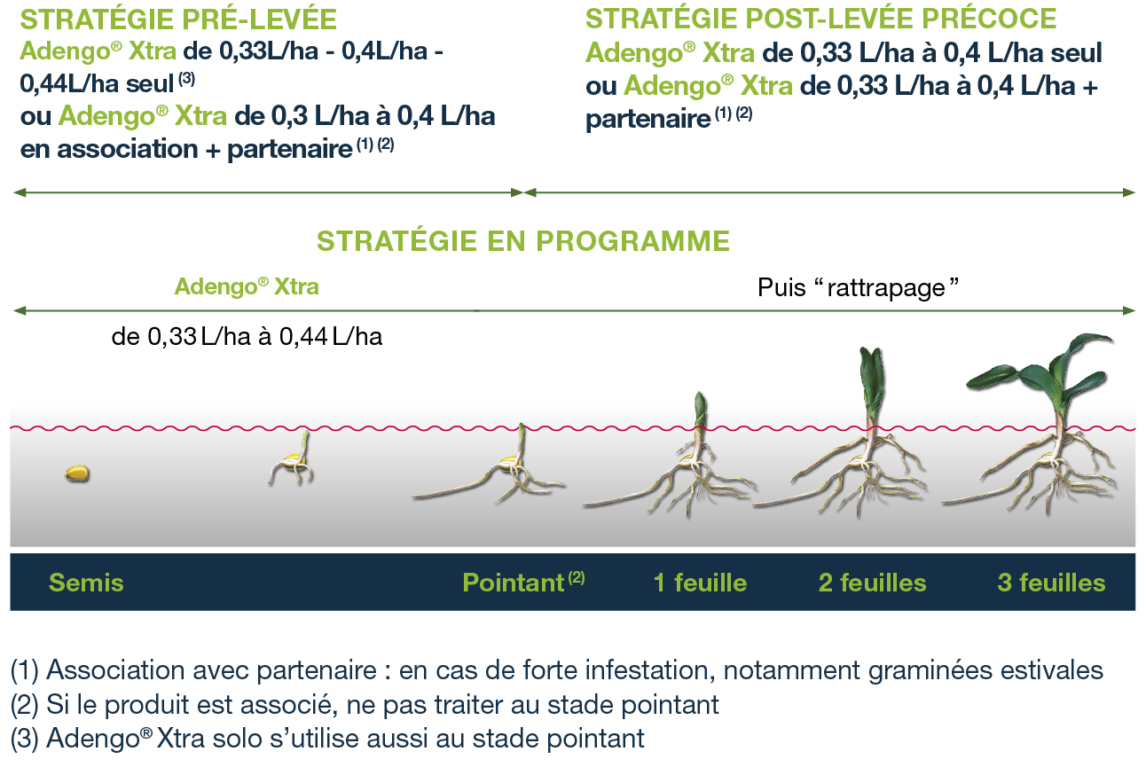 Adengo® Xtra peut être appliqué en post-semis/pré-levée ou en post-levée précoce. La stratégie de désherbage va dépendre :