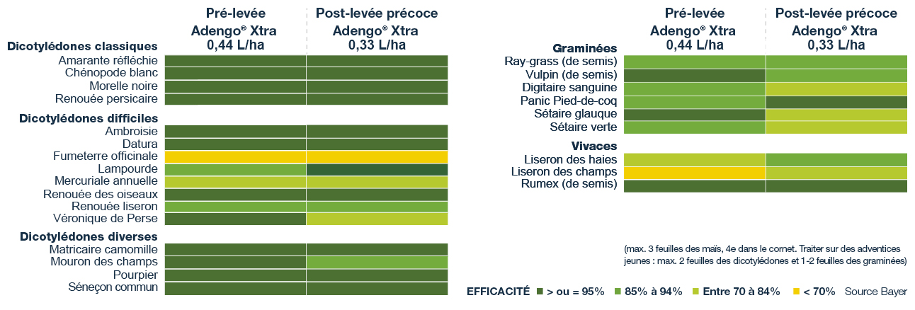 Adengo® Xtra cible l’ensemble des flores présentes en maïs. Grâce à cette largeur de spectre, on limite le besoin de prévoir un traitement de rattrapage et de ressortir son pulvérisateur. Sur dicotylédones, graminées et vivaces, Adengo® Xtra se révèle très performant.