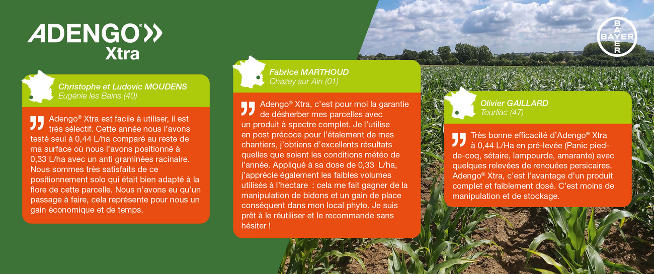 En 2023, Bayer a réalisé un test en grandes parcelles et en conditions réelles d'Adengo® Xtra, herbicide maïs de pré-levée et de post-levée précoce, auprès de 11 producteurs de maïs du réseau Datagri.