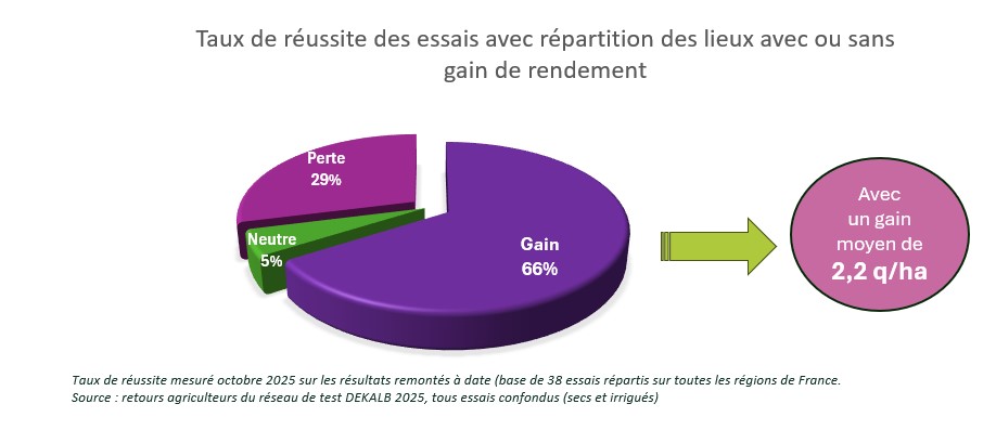À l’issue de la campagne 2024, les 38 essais du biostimulant Best-a en solo révèlent un effet globalement positif sur le rendement. Dans ce cadre, le rendement moyen augmente de 4.2 quintaux par hectare, avec un taux de succès de 61 % sur ces 38 lieux. L’efficacité du Best-a se manifeste aussi bien en culture sèche qu’en culture irriguée.