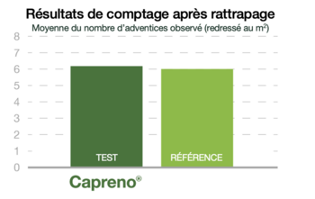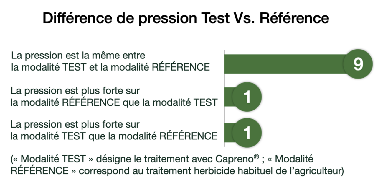Conditions : Les parcelles sur lesquelles le test est réalisé ont une surface moyenne de 14 ha, avec une pression adventice variable, généralement jugée moyenne à forte. Les agriculteurs testeurs estiment que les produits ont été appliqués dans de bonnes à très bonnes conditions (température moyenne de 15°C, hygrométrie comprise entre 55 et 98% avec une moyenne à 72%, force du vent jugée faible à nulle). Les conditions d'applications étaient les mêmes pour Capreno® et la modalité de référence.