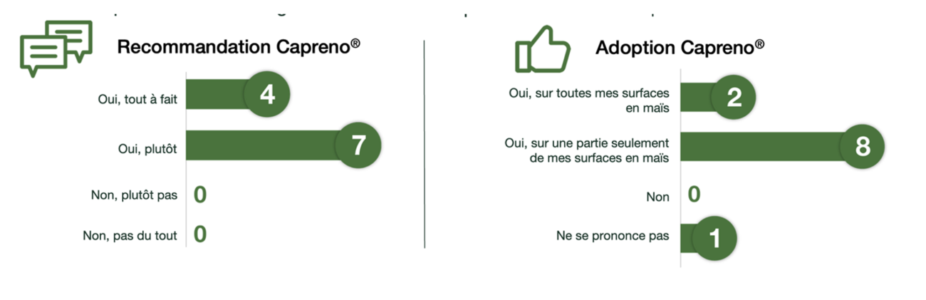 100% des agriculteurs testeurs sont prêts à recommander Capreno® à d’autres agriculteurs et 91% d’entre eux se disent prêts à l'adopter sur au moins une partie de leurs surfaces en maïs.