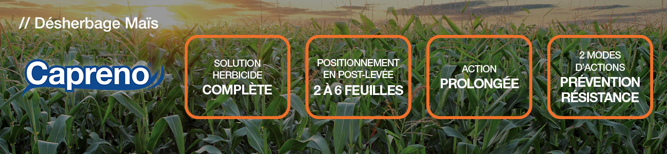 En réponse aux problématiques de désherbage des maïsiculteurs, l’herbicide de post-levée Capreno® assure une efficacité de très haut niveau sur un large spectre d’adventices (graminées et dicotylédones, flores émergentes et difficiles) et permet de prévenir les risques de résistances. De plus, il offre de la flexibilité en terme de positionnement pour faciliter le travail au champ. Présentation