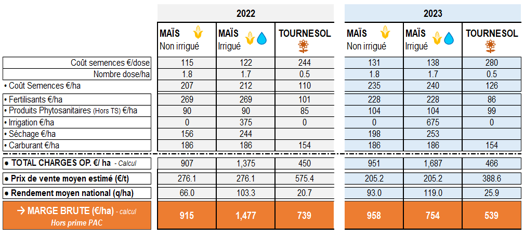 Valeur des charges opé. issues des données panels 2022 et 2023 (6 tours d’eau en maïs irrigué), cours du maïs et tournesol moyens sur les campagnes correspondantes, et rendements nationaux Agreste.