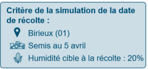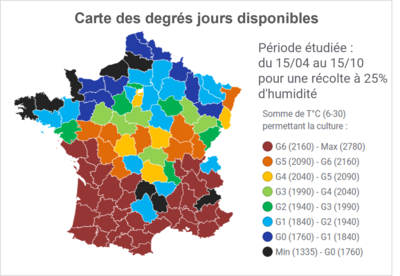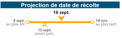 La connaissance fine de la physiologie de nos variétés croisée aux données météo géolocalisées nous permettent de faire des prédictions sur la date théorique de récolte en fonction de la variété choisie. La date « au plus tôt » correspond à une année historiquement chaude, tandis que la date « au plus tard » correspond à une année exceptionnellement froide.