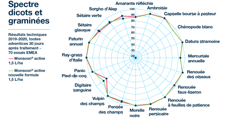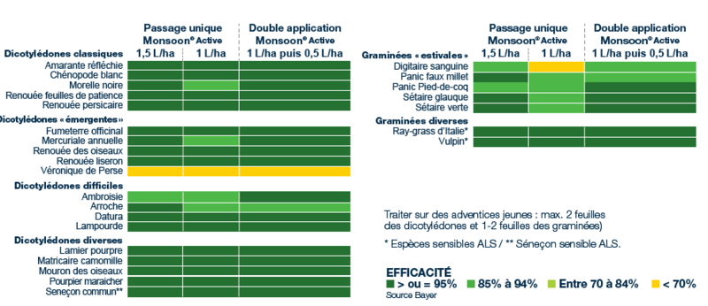 Dès 1 l/ha, en une application, Monsoon® active/Mondine® sont efficaces à plus de 85 % sur la majorité des graminées (panic pied-de-coq, sétaire) et des dicotylédones (renouée liseron, renouée des oiseaux, renouée persicaire, mercuriale, chénopodes, morelle, amarante…).