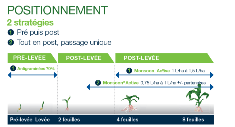 Avec leur spectre large, leur action prolongée et leurs 2 positionnements, Monsoon® active/Mondine® permettent d’optimiser les campagnes de désherbage maïs et l’organisation du travail.