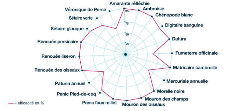 - une action prolongée qui permet le contrôle des levées échelonnées sur graminées et dicotylédones, même difficiles.