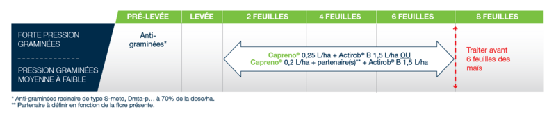 Capreno® s’utilise en post-levée, entre le stade 2 à 6 feuilles, selon la flore présente, la situation pédoclimatique des parcelles et les impératifs en terme d’organisation du temps de travail, ce qui assure une réelle flexibilité au champs.