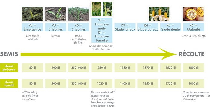 Somme de températures maïs = degré jours cumulés depuis le semis (attention, certains semenciers travaillent à partir de l’émergence, ce qui implique un biais d’environ 80 degré jours)