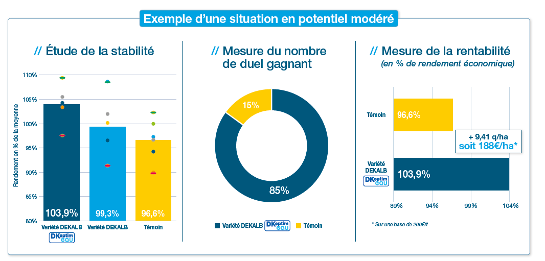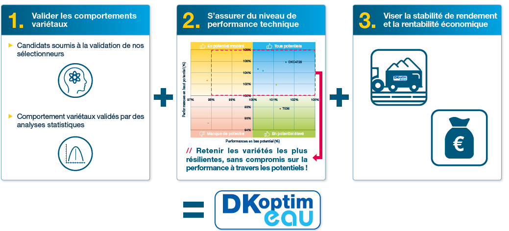 Pour répondre à ces enjeux, DEKALB® a développé le label DKoptim’eau. Ce cahier des charges rigoureux certifie les variétés capables d’optimiser l’utilisation de l’eau, même en cas de stress hydrique ou thermique, pour garantir des rendements maximisés.