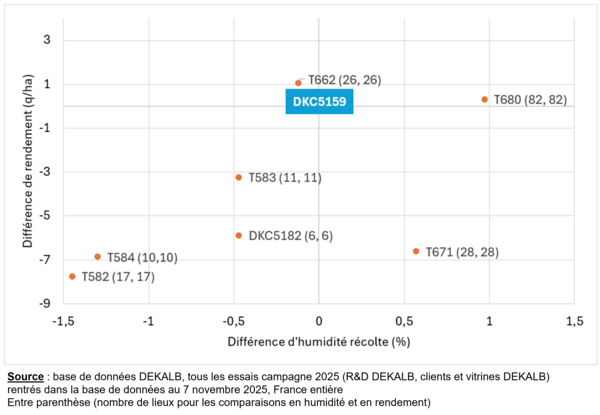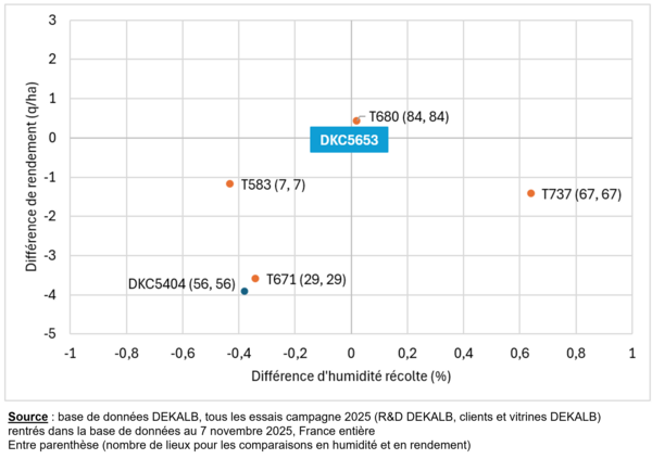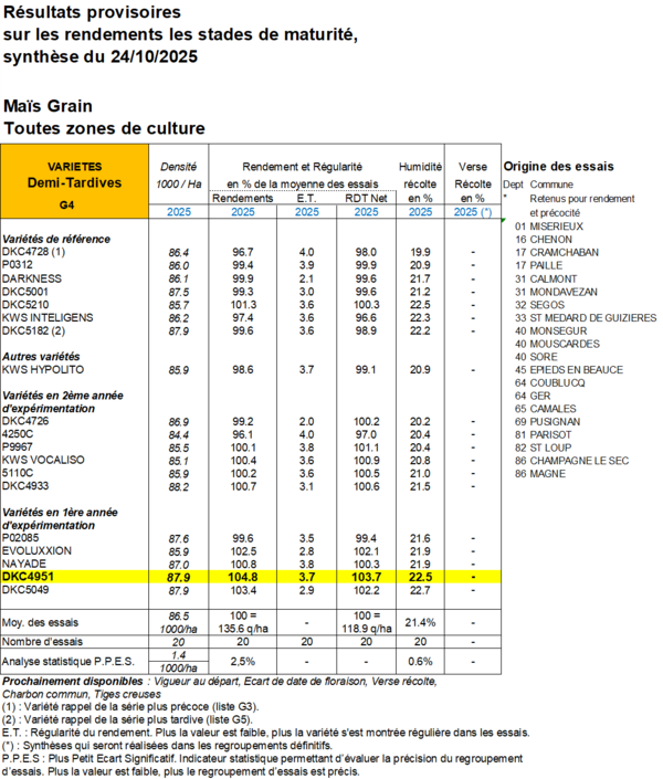 Par exemple, dans le réseau d’essais DEKALB menés en 2024, il atteint 103,3 % de rendement en Nouvelle-Aquitaine et 105,5 % dans les Pays de la Loire.