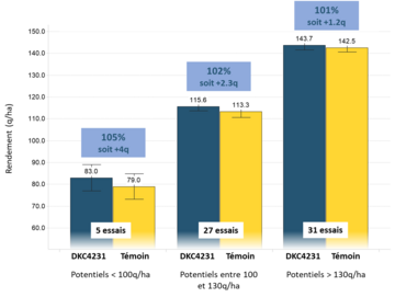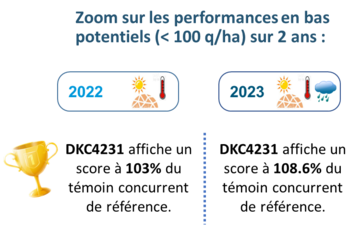 - En 2023, dans des parcelles à bas potentiel de production, DKC4231 affiche un score à 108,6 % du témoin concurrent de référence. Quels que soient les potentiels et les conditions pédoclimatiques, DKC4231 amène du potentiel et de la sécurité !