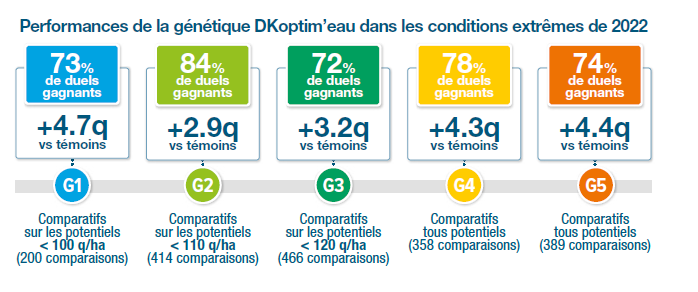 - Ainsi, en année stressante comme en 2022, marquée par une longue période de sécheresse, de 2,4 q/ha à 8,4 q/ha supplémentaires ont même été obtenus face aux témoins demi-précoces sur les différents niveaux de potentiels.