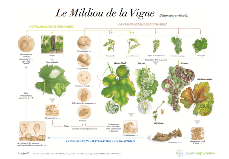 Le mildiou se conserve sous forme d’oospores présentes sur les feuilles attaquées à l’automne et tombées au sol. Ces œufs d’hiver sont produits par la reproduction sexuée. Ils sont très résistants aux basses températures, jusqu’à -20 à – 26 °C et très dépendants du taux d’humidité.
