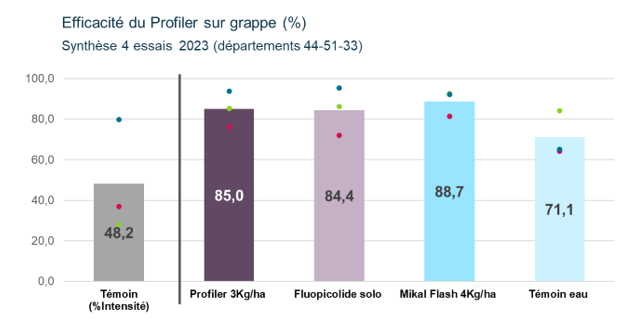 Les essais menés par Bayer en 2023, dans trois départements, montrent une bonne contribution de Profiler® (85%) sur l'efficacité des programmes en situation de dérive de sensibilité.