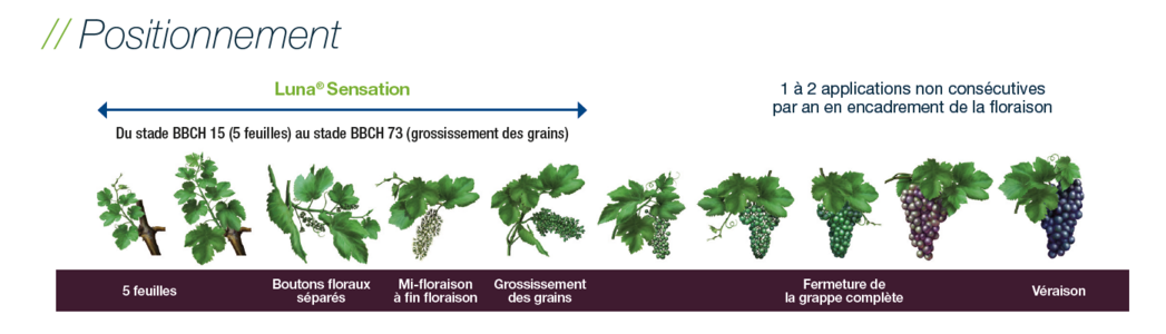 Luna® Sensation est préconisé en préventif particulièrement à la période de forte sensibilité des feuilles et grappes entre les stades boutons floraux séparés et début du grossissement du grain (ne pas dépasser le stade BBCH 73). Les applications se limitent à deux par ha et par an, non consécutives.
