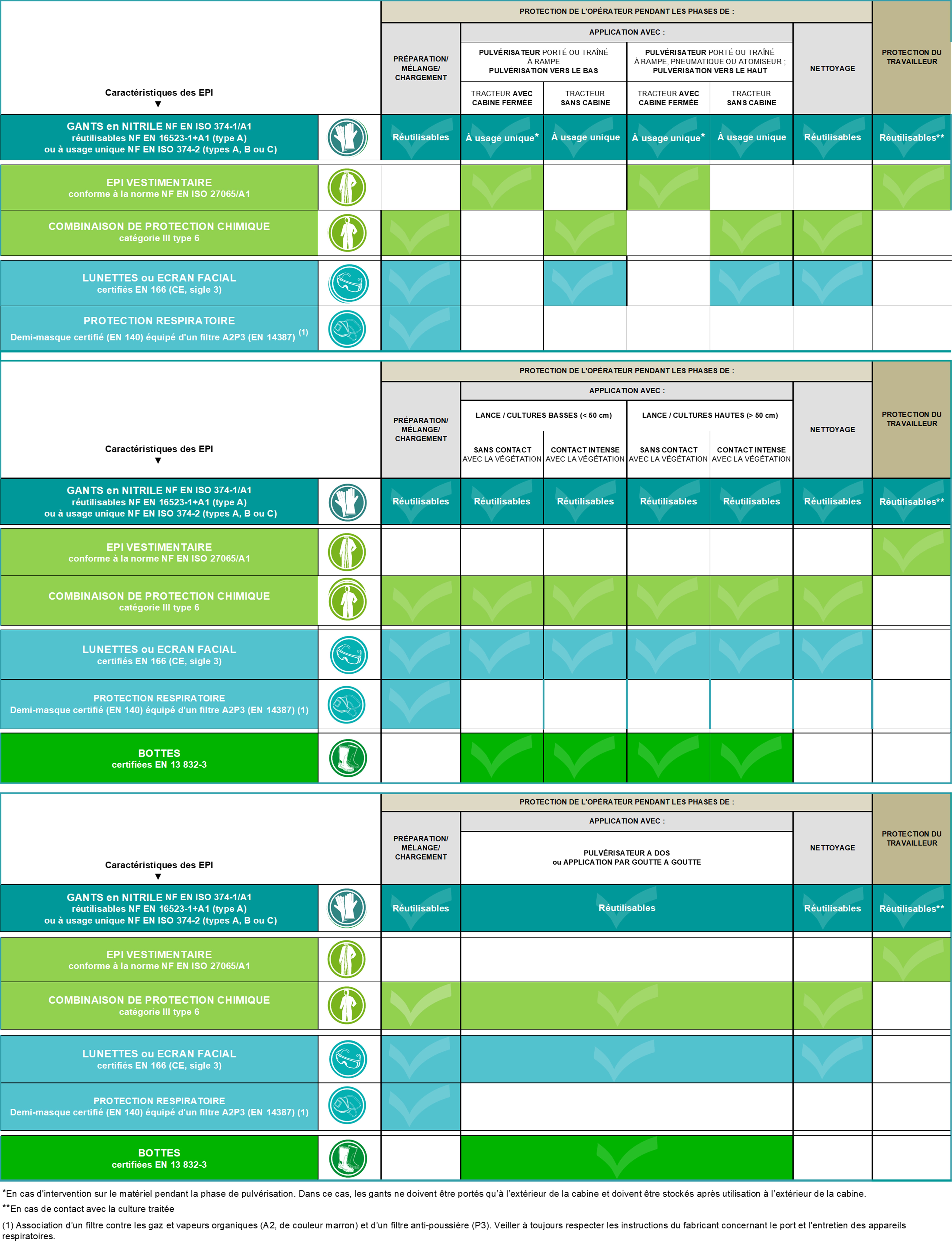 Raisonner l’ergonomie, l’organisation du travail, la protection collective et enfin les équipements de protection individuelle. La responsabilité du choix et de la décision du port des E.P.I. revient à l’agriculteur ou à l’employeur de salariés utilisateurs de produits phytopharmaceutiques. Le salarié utilisateur est également responsable de la décision du port de ces équipements.